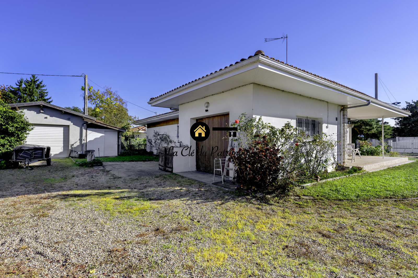 Un garage indépendant comprenant une cave enterrée se situe à l'arrière de la parcelle. Un puit foré complète le bien. Le jardin est clôturé et arboré, avec un accès large pour plusieurs véhicules.
