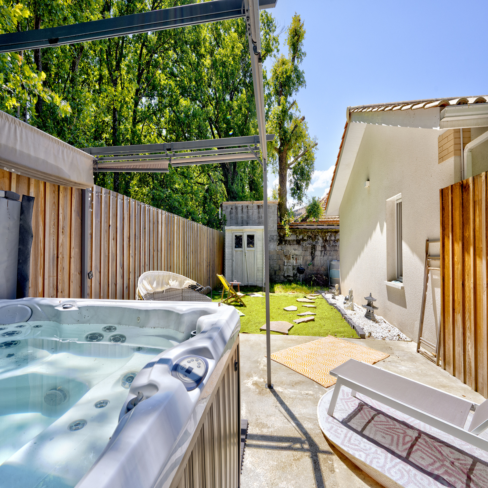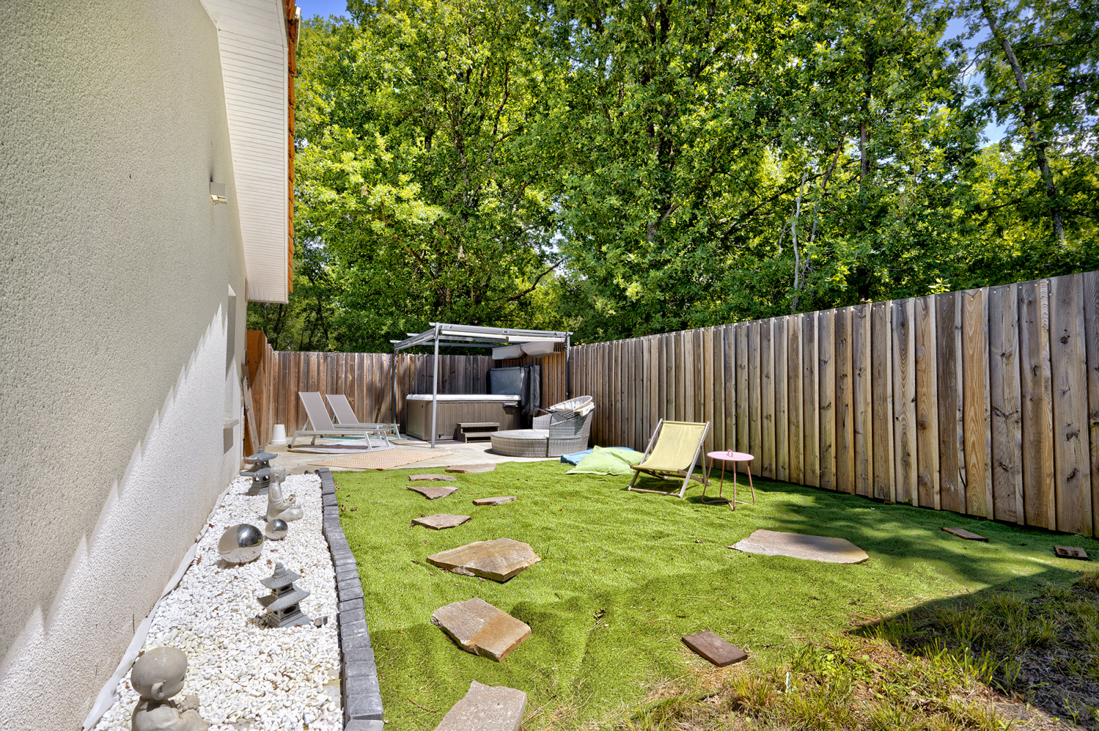 Le jardin clos, sans aucun vis-à-vis, est un véritable cocon de verdure, un écrin de calme pour les amoureux de la nature avec un spa de marque Jacuzzi, parfait pour des instants de détente en toute intimité.