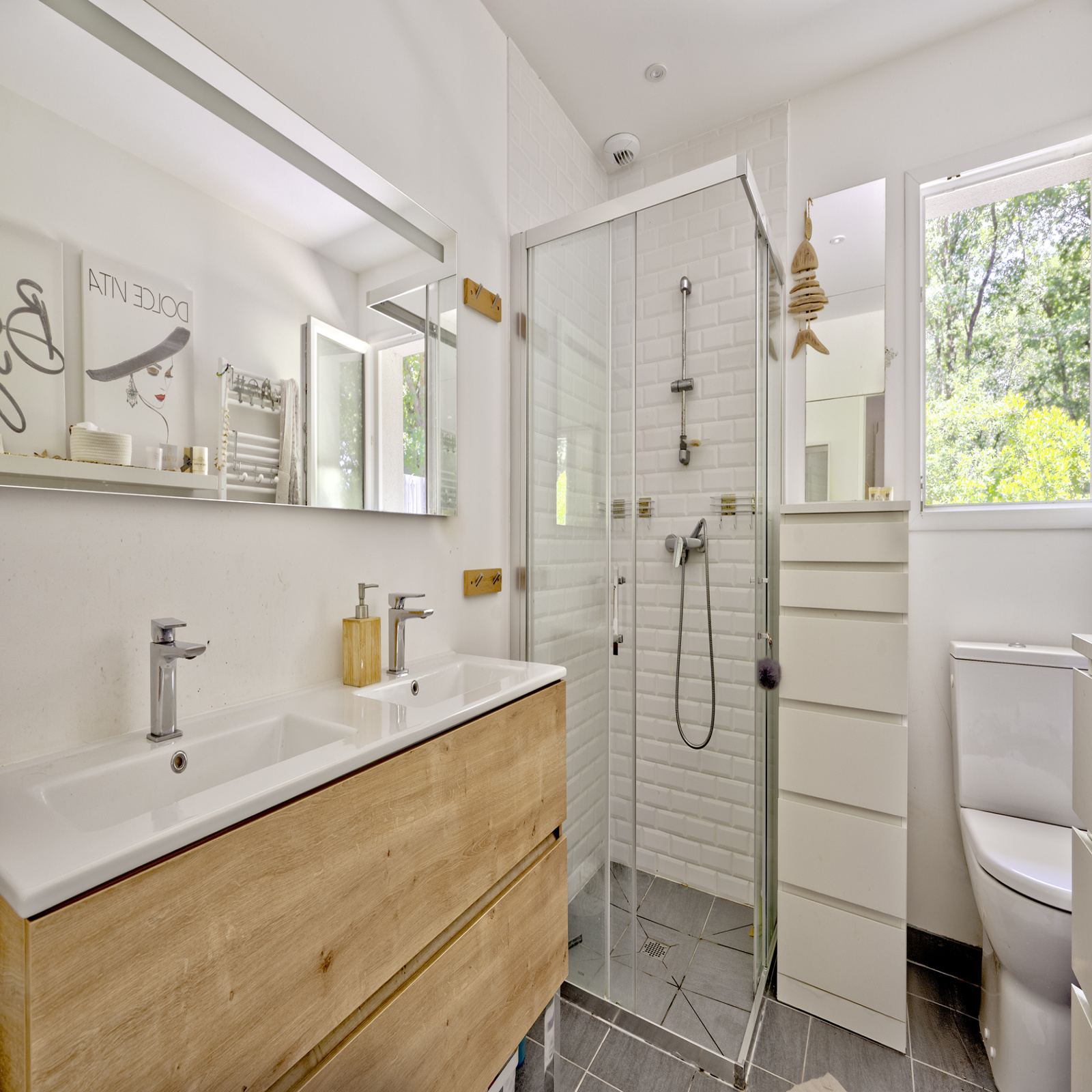 LA CLE DU PATRIMOINE vous propose cette maison contemporaine d'une surface habitable de 80 m², construite en 2017, nichée dans un quartier résidentiel, paisible et calme en lisière de forêt. Elle offre une entrée avec placard, une pièce de vie traversante lumineuse et fonctionnelle donnant sur une terrasse de 30 m² exposée plein sud, une cuisine ouverte aménagée et équipée, un cellier. Côté nuit, trois chambres confortables avec placards dont une avec salle d'eau attenante, une deuxième salle d'eau, wc indépendant. Climatisation réversible pour un confort optimal toute l’année.