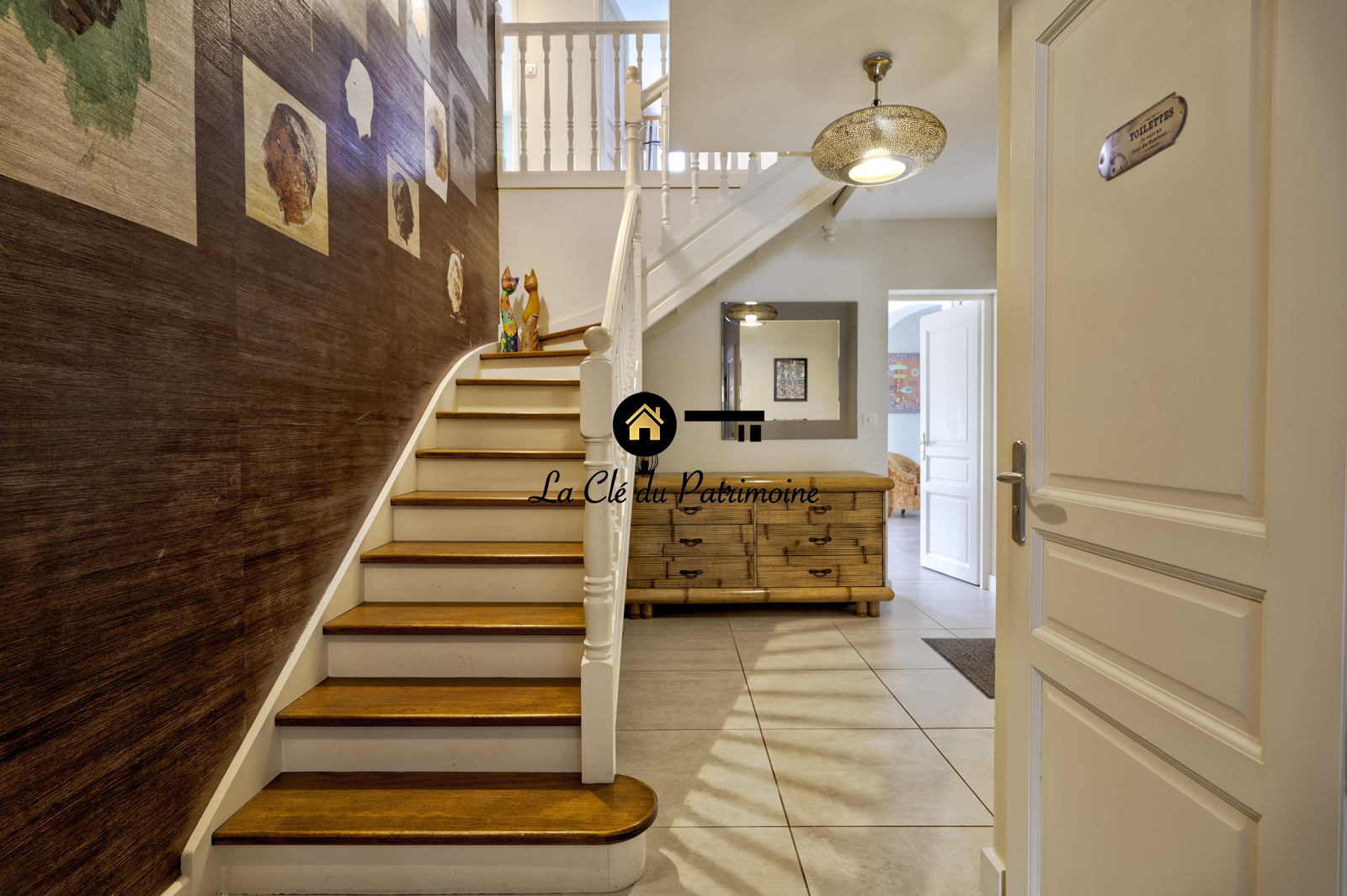 La maison est édifiée sur deux niveaux. Le rez de chaussée se compose d'une grande entrée, d'une immense pièce de vie orientée plein Sud avec cheminée d'environ 55 m2 donnant sur la terrasse et la piscine. Ambiance vacances assurée. La cuisine, très spacieuse, est entièrement aménagée et équipée avec des matériaux et de l'électroménager de qualité. Une arrière cuisine fait office de buanderie avec évier et donne sur le patio. Un salon coin télé d'environ 20 m2 ainsi qu'une suite parentale d'environ 18 m2 avec wc et salle d'eau sont situés au rez de chaussée.